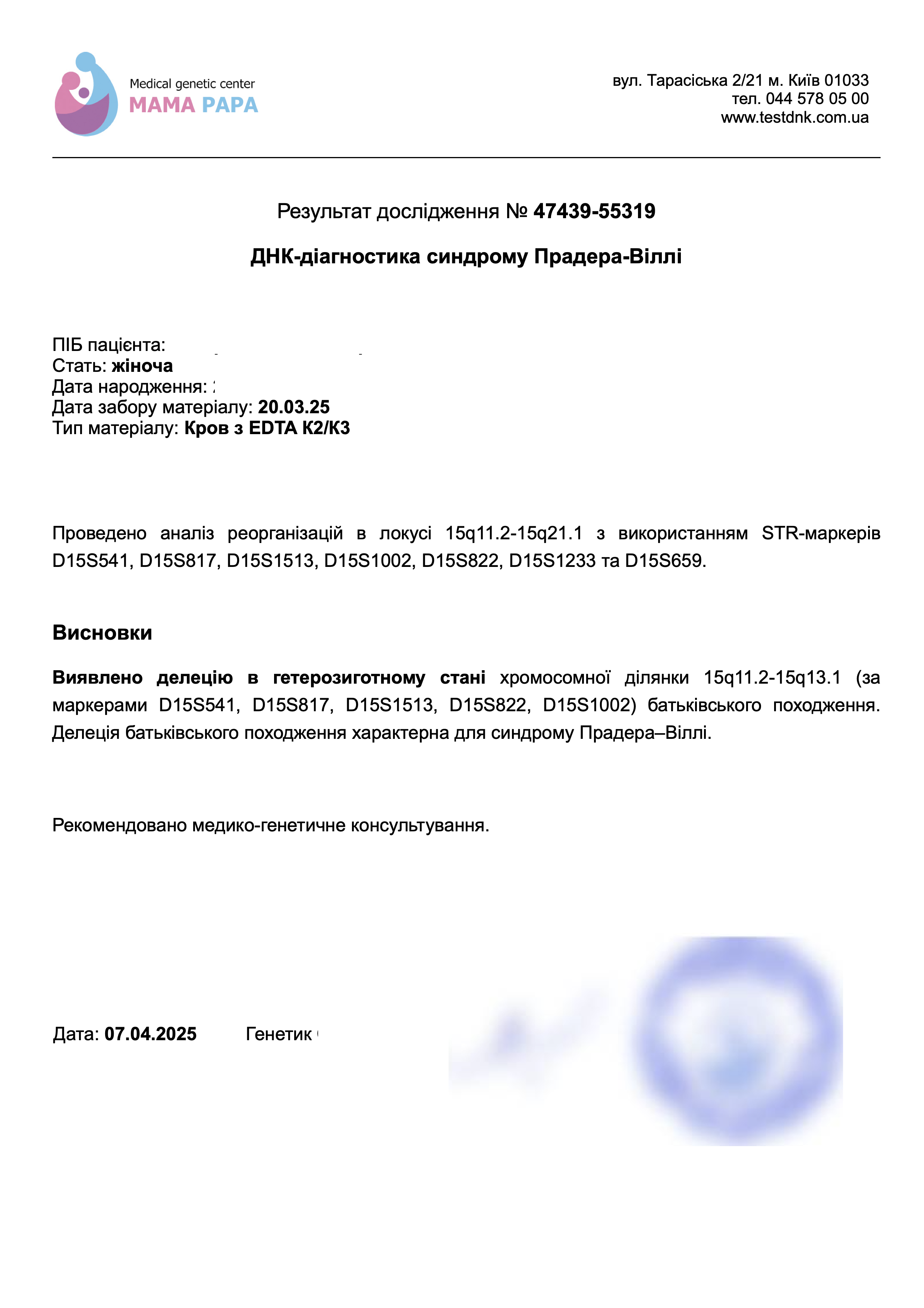 Исследование предназначено для подтверждения или исключения синдрома Прадера-Вилли (PWS) у ребенка. В основе синдрома лежат нарушения геномного импринтинга — явления, при котором активность определенных генов зависит от того, были ли они унаследованы от матери или отца. Такие нарушения в области 15q11.2–13.3 могут приводить к развитию характерных симптомов.