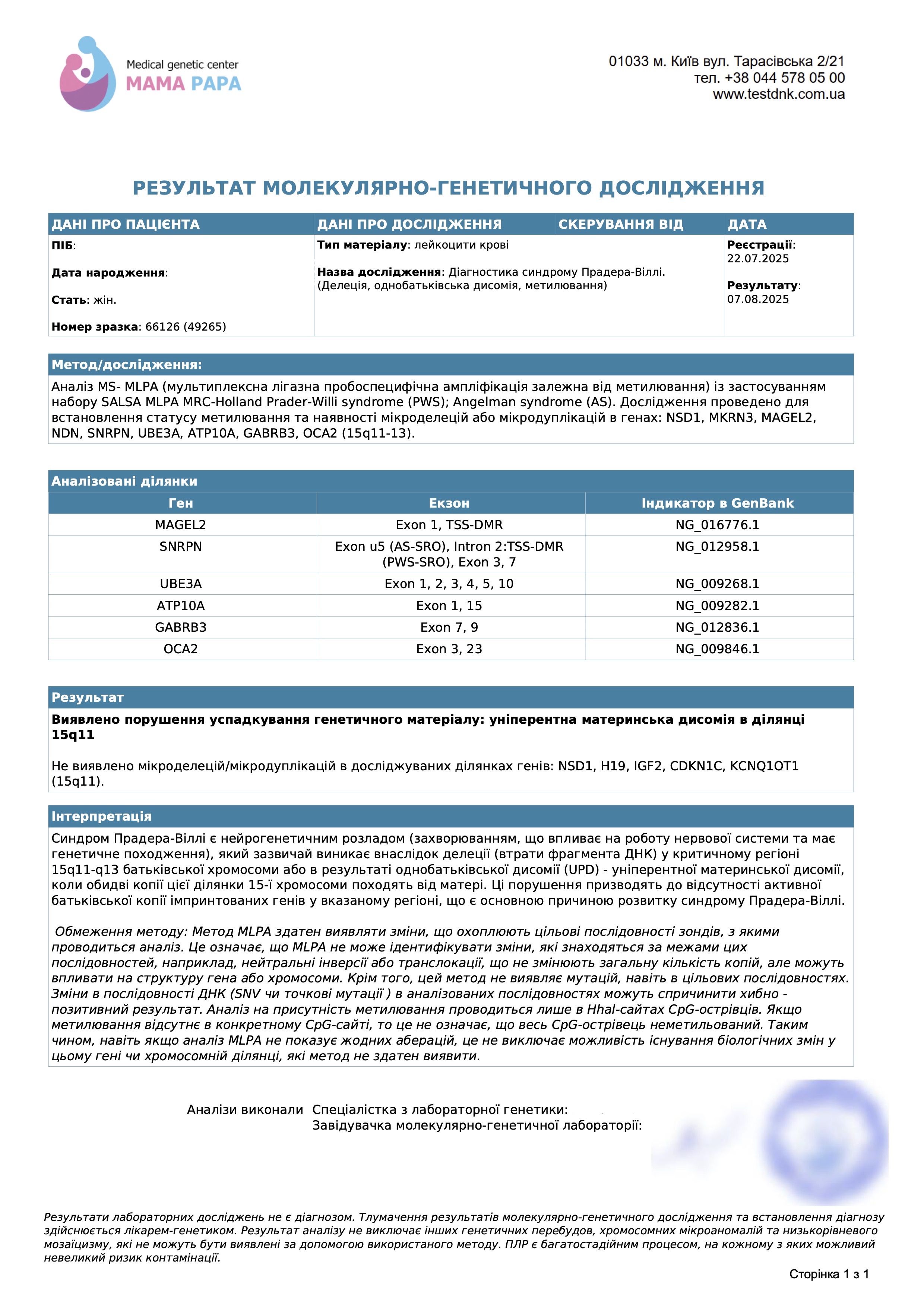 Тест охватывает следующие гены и экзоны в регионе 15q11–q13: